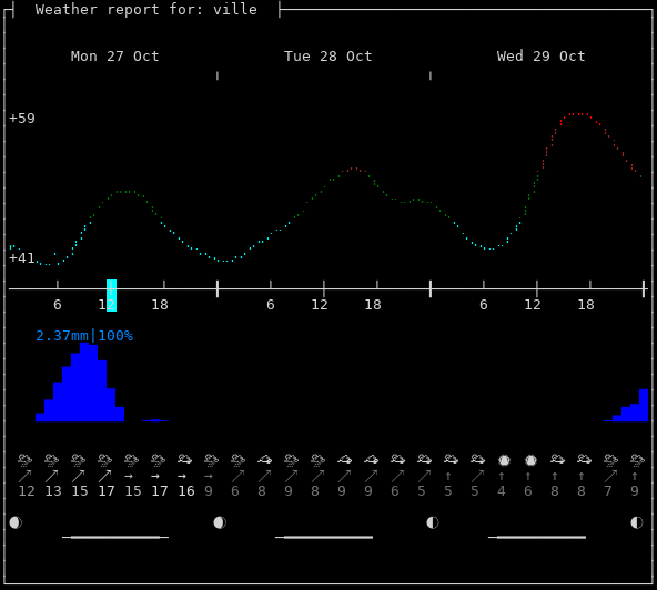 Weather: 🌦 Light rain, +47°F, 81%, ↗17mph, 1005hPa Timezone: Europe/Paris Now: 07:42:23+0100 | Dawn: 06:36:12 | Sunrise: 07:09:09 Zenith: 12:14:38 | Sunset: 17:19:20 | Dusk: 17:52:15 Location: Villé, Sélestat-Erstein, Bas-Rhin, Grand-Est [48.3426,7.3035]Follow @igor_chubin wttr.in pyphoon wego