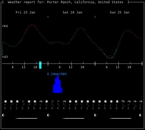 Weather: ⛅️ Partly cloudy, +60°F, 82%, ↗5mph, 1012hPa Timezone: America/Los_Angeles Now: 17:59:23-0800 | Dawn: 06:29:32 | Sunrise: 06:56:49 Zenith: 12:06:11 | Sunset: 17:16:16 | Dusk: 17:43:33
