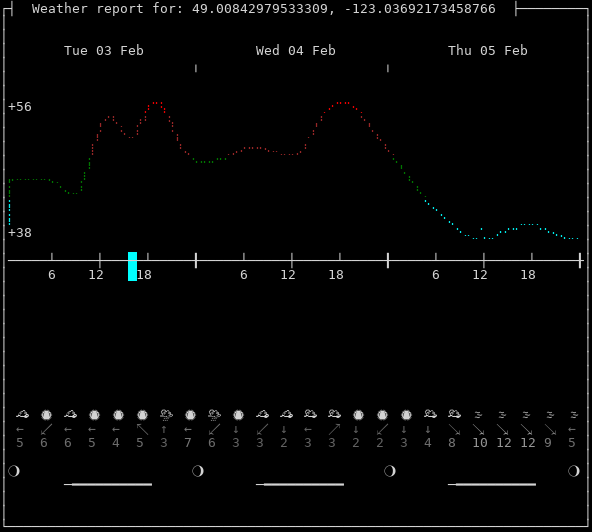 Weather: ☀️ Sunny, +51°F, 87%, ←2mph, 1026hPa Timezone: America/Vancouver Now: 13:44:37-0800 | Dawn: 07:05:20 | Sunrise: 07:39:47 Zenith: 12:25:54 | Sunset: 17:12:49 | Dusk: 17:47:17 Location: 296 Centennial Parkway, Delta, BC V4L 1A1, Canada [49.0083,-123.0370]Follow @igor_chubin wttr.in pyphoon wego