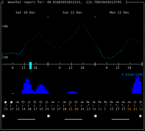 Weather: 🌧 Moderate rain at times, +45°F, 77%, ↑18mph, 1009hPa Timezone: America/Vancouver Now: 12:31:52-0800 | Dawn: 07:24:27 | Sunrise: 08:02:39 Zenith: 12:08:37 | Sunset: 16:15:23 | Dusk: 16:53:35 Location: Finlay Street, White Rock, BC V4B, Canada [49.0166,-122.7902]Follow @igor_chubin wttr.in pyphoon wego