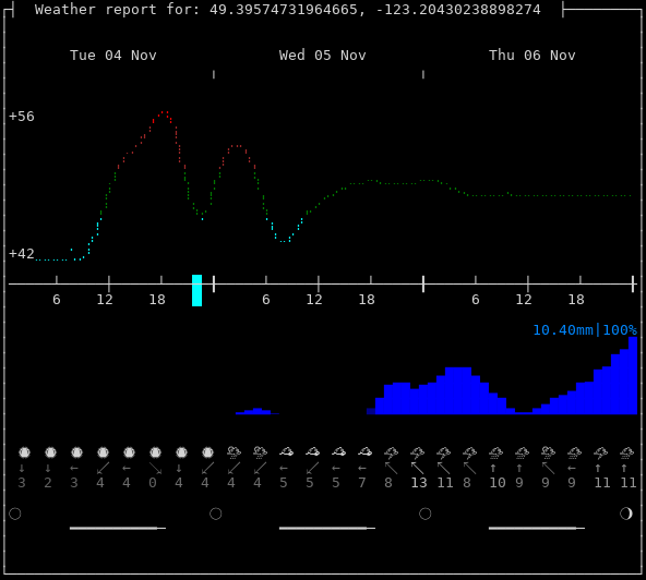 Weather: ☀️ Clear, +40°F, 86%, ↓2mph, 1011hPa Timezone: America/Vancouver Now: 03:23:51-0800 | Dawn: 06:32:24 | Sunrise: 07:06:56 Zenith: 11:56:19 | Sunset: 16:45:07 | Dusk: 17:19:36 Location: Cypress Creek Lodge, Yew Lake Trail [49.3960,-123.2046]Follow @igor_chubin wttr.in pyphoon wego