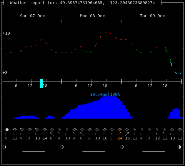 Weather: 🌧 Moderate rain, +12°C, 99%, ←2.8m/s, 1003hPa Timezone: America/Vancouver Now: 06:54:37-0800 | Dawn: 06:45:56 | Sunrise: 07:21:29 Zenith: 11:57:01 | Sunset: 16:32:15 | Dusk: 17:07:46 Location: Cypress Creek Lodge, Yew Lake Trail [49.3960,-123.2046]Follow @igor_chubin wttr.in pyphoon wego