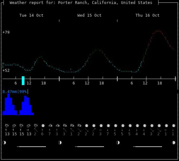 Weather: 🌦 Light rain, mist, +56°F, 97%, ↑16mph, 1009hPa Timezone: America/Los_Angeles Now: 04:36:25-0700 | Dawn: 06:33:32 | Sunrise: 06:59:18 Zenith: 12:40:16 | Sunset: 18:20:22 | Dusk: 18:46:06