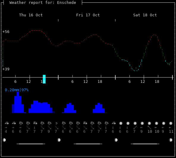 Weather: ⛅️ Partly cloudy, +56°F, 88%, ↓7mph, 1024hPa Timezone: Europe/Amsterdam Now: 14:47:44+0200 | Dawn: 07:24:50 | Sunrise: 07:59:51 Zenith: 13:18:06 | Sunset: 18:35:17 | Dusk: 19:10:14 Location: Enschede, Regio Twente, Overijssel, Nederland [52.2233,6.8716]Follow @igor_chubin wttr.in pyphoon wego