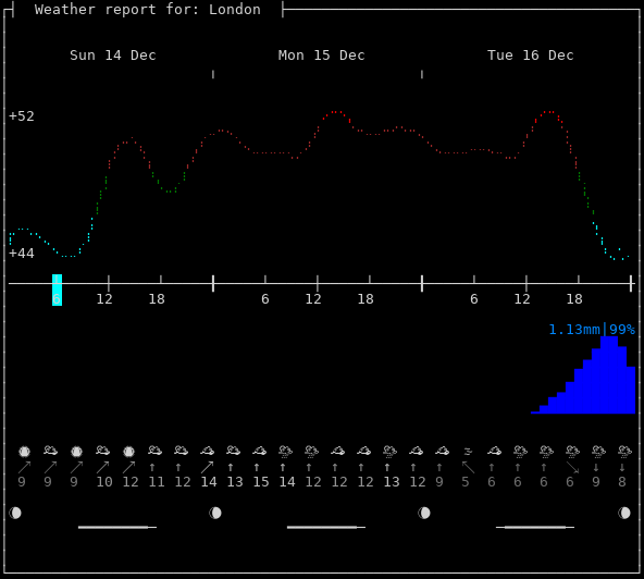 Weather: ⛅️ Partly cloudy, +43°F, 93%, ↗9mph, 1024hPa Timezone: Europe/London Now: 01:10:35+0000 | Dawn: 07:18:26 | Sunrise: 07:59:22 Zenith: 11:55:02 | Sunset: 15:51:03 | Dusk: 16:32:00 Location: London, Greater London, England, UK [51.5073,-0.1277]Follow @igor_chubin wttr.in pyphoon wego