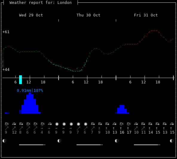 Weather: ⛅️ Partly cloudy, +54°F, 88%, ↗12mph, 1003hPa Timezone: Europe/London Now: 04:16:36+0000 | Dawn: 06:13:45 | Sunrise: 06:49:19 Zenith: 11:44:11 | Sunset: 16:38:16 | Dusk: 17:13:47 Location: London, Greater London, England, UK [51.5073,-0.1277]Follow @igor_chubin wttr.in pyphoon wego