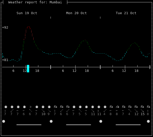 Weather: 🌫 Haze, +87°F, 62%, ↙5mph, 1009hPa Timezone: Asia/Kolkata Now: 09:50:38+0530 | Dawn: 06:11:33 | Sunrise: 06:34:08 Zenith: 12:23:39 | Sunset: 18:12:50 | Dusk: 18:35:24 Location: Mumbai, Greater Bombay, Maharashtra, India [18.9321,72.8302]Follow @igor_chubin wttr.in pyphoon wego