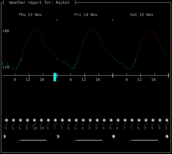 Weather: ☀️ Clear, +77°F, 35%, ↙7mph, 1016hPa Timezone: Asia/Kolkata Now: 21:14:38+0530 | Dawn: 06:34:02 | Sunrise: 06:57:59 Zenith: 12:30:59 | Sunset: 18:03:51 | Dusk: 18:27:48 Location: Rajkot, Gujarat, 360001, India [22.3046,70.8022]Follow @igor_chubin wttr.in pyphoon wego