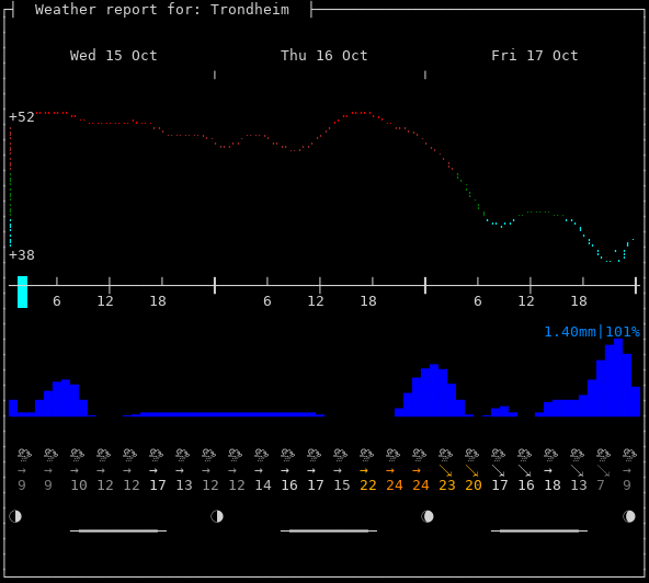 Weather: ⛅️ Partly cloudy, +52°F, 87%, →13mph, 1022hPa Timezone: Europe/Oslo Now: 21:49:44+0200 | Dawn: 07:16:10 | Sunrise: 08:04:26 Zenith: 13:04:27 | Sunset: 18:03:00 | Dusk: 18:51:05 Location: Trondheim, Sør-Trøndelag, Norge [63.4305,10.3951]Follow @igor_chubin wttr.in pyphoon wego