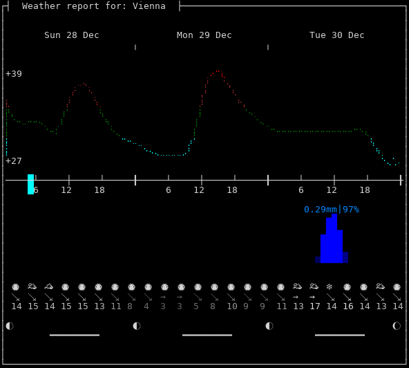 Weather: ⛅️ Partly cloudy, +36°F, 75%, ↘15mph, 1023hPa Timezone: Europe/Vienna Now: 02:48:51+0100 | Dawn: 07:07:58 | Sunrise: 07:45:13 Zenith: 11:55:55 | Sunset: 16:07:10 | Dusk: 16:44:24 Location: Wien, Österreich [48.2086,16.3725]Follow @igor_chubin wttr.in pyphoon wego