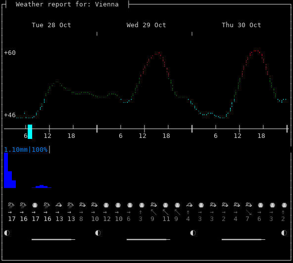 Weather: 🌦 Light rain shower, +48°F, 71%, →17mph, 1009hPa Timezone: Europe/Vienna Now: 04:17:30+0100 | Dawn: 06:01:09 | Sunrise: 06:34:06 Zenith: 11:38:16 | Sunset: 16:41:41 | Dusk: 17:14:35 Location: Wien, Österreich [48.2086,16.3725]Follow @igor_chubin wttr.in pyphoon wego