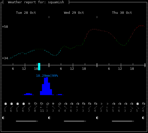 Weather: 🌦 Patchy rain nearby, +41°F, 97%, ↙7mph, 935hPa Timezone: America/Vancouver Now: 13:52:32-0700 | Dawn: 07:21:59 | Sunrise: 07:56:02 Zenith: 12:56:21 | Sunset: 17:55:51 | Dusk: 18:29:52 Location: Squamish, Squamish-Lillooet Regional District [49.7014,-123.1512]Follow @igor_chubin wttr.in pyphoon wego