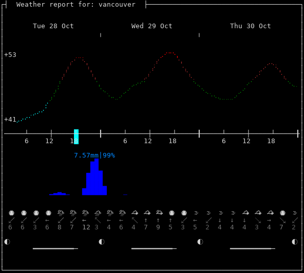 Weather: 🌦 Light rain, +48°F, 81%, ↙10mph, 1021hPa Timezone: America/Vancouver Now: 13:55:13-0700 | Dawn: 07:21:11 | Sunrise: 07:54:55 Zenith: 12:56:13 | Sunset: 17:56:42 | Dusk: 18:30:23 Location: Vancouver, Greater Vancouver Regional District [49.2625,-123.1155]Follow @igor_chubin wttr.in pyphoon wego
